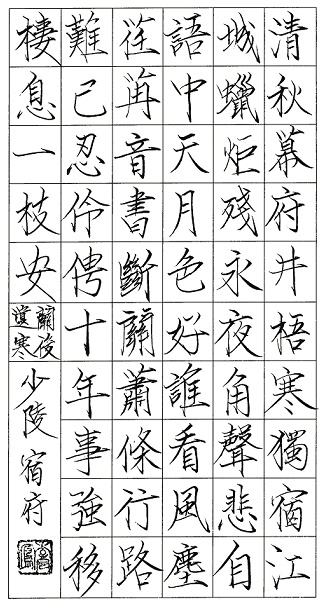 前两联写“独宿”之景,而情含景中。后两联则就“独宿”之景,直抒“独宿”之情。“风尘”句紧承“永夜”句。“永夜角声”,意味着战乱未息。那悲凉的、自言自语的“永夜角声”,引起诗人许多感慨。“风尘荏苒音书绝”,就是那许多感慨的中心内容。“风尘荏苒”,指战乱延续的时间很长。诗人时常想回到故乡洛阳,却由于“风尘荏苒”,连故乡的音信都得不到。“关塞”句紧承“中天”句。诗人早在《恨别》一诗里写道:“洛城一别四千里,胡骑长驱五六年。草木变衰行剑外,兵戈阻绝老江边。思家步月清宵立,忆弟看云白日眠。”好几年又过去了,诗人却仍然流落剑外,一个人在这凄清的幕府里长夜不眠,仰望中天明月,不由得心事重重。“关塞萧条行路难”,就是那重重心事之一。思家、忆弟之情有增无已,因为他还是没有办法回到洛阳。这一联直抒“宿府”之情。但“宿府”时的心情很复杂,用两句诗无法写完。于是用“伶俜十年事”加以概括,意蕴深远。