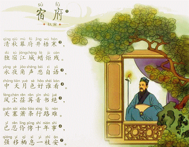 杜甫(712~770年),字子美,尝自称少陵野老。举进士不第,曾任检校工部员外郎,故世称杜工部。是唐代最伟大的现实主义诗人,宋以后被尊为“诗圣”,与李白并称“李杜”。其诗大胆揭露当时社会矛盾,对穷苦人民寄予深切同情,内容深刻。许多优秀作品,显示了唐代由盛转衰的历史过程,因被称为“诗史”。在艺术上,善于运用各种诗歌形式,尤长于律诗;风格多样,而以沉郁为主;语言精炼,具有高度的表达能力。存诗1400多首,有《杜工部集》。