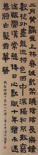 长乐钟声花外尽,龙池柳色雨中深。出自唐代诗人钱起作品《赠阙下裴舍人》。此诗以其用景色隐含的请求提携之意,和不落窠臼的恭维手段而闻名。前半部分以写景为主,但融情于景;后半部分以抒情为主,但思与景谐。诗人含蓄地赞颂了裴舍人,并委婉地陈述了自己的心事。全诗未有一句是明写作者自己之情,却在景色和感情的描写中点明了自己的想法,富丽精工,又不流于藻饰堆砌,由此颇见作者娴熟的艺术技巧。