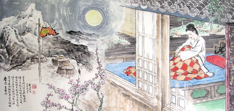 良辰美景,未必便能带来欢乐;温柔乡里,最易惹动离情。“家住秦城邻汉苑”,秦城指咸阳,汉苑指长安。诗中的女主人公虽然目睹京畿的繁华与和平,却是“心随明月到胡天”,早巳飞到丈夫的身边。关河万里,能隔断人的形体,却隔不断心灵的呼唤,而作为心灵交通媒介的,大概只有那普照万方的明月了。