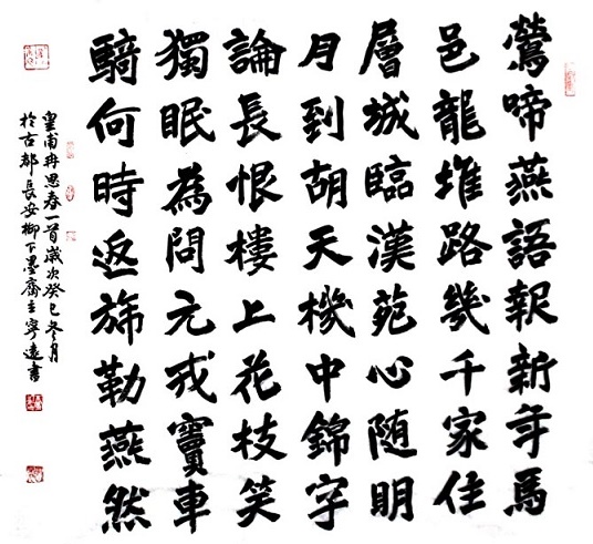 首联“莺啼燕语报新年,马邑龙堆路几千”,对比鲜明,动人心弦。“莺啼燕语”,这是和平宁静的象征;新年佳节,这是亲人团聚的时辰。但是,另一方面,在那遥远的边关,从征的亲人却不能享受这宁静,无法得到这温情。上句“莺啼燕语”四字,写得色彩浓丽,生意盎然。使下句“马邑龙堆”,更显得沉郁悲壮。诗人好似信笔而下,但震撼力却很强。