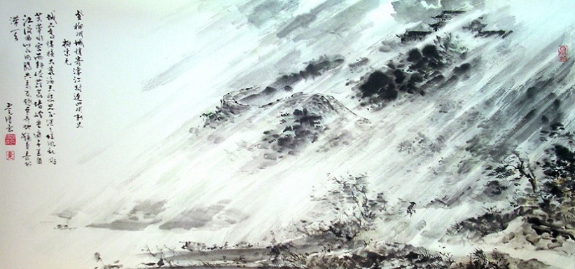 第二联“惊风乱飐芙蓉水,密雨斜侵薜荔墙”,写的是近处所见。惟其是近景,见得真切,故写得细致。就描绘风急雨骤的景象而言,这是“赋”笔,而赋中又兼有比兴。屈原《离骚》有云:“制芰荷以为衣兮,集芙蓉以为裳。不吾知其亦已兮,苟余情其信芳。”又云:“擥木根以结茝兮,贯薜荔之落蕊;矫菌桂以纫蕙兮,索胡绳之纚纚。謇吾法大前修兮,非世俗之所服。”在这里,芙蓉与薜荔,正象征着人格的美好与芳洁。登城楼而望近处,从所见者中特意拈出芙蓉与薜荔,显然是它们在暴风雨中的情状使诗人心灵颤悸。风而曰惊,雨而曰密,飐而曰乱,侵而曰斜,足见对客观事物又投射了诗人的感受。芙蓉出水,何碍于风,而惊风仍要乱飐;薜荔覆墙,雨本难侵,而密雨偏要斜侵。这不禁使诗人产生联想,愁思弥漫。在这里,景中之情,境中之意,赋中之比兴,有如水中着盐,不见痕迹。
