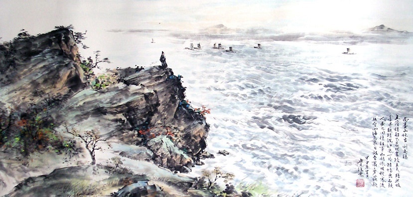 诗的前四句,洗炼、紧凑,在对比之中写出了双方的强弱,进攻的路线,攻守的方式,战争的结局。它只用第一句诗写西晋水军出发,下面就单写东吴:在战争开始的反映,苦心经营的工事被毁,直到举旗投降,步步紧逼,一气直下。人们不仅看到了失败者的形象,也看到了胜利者的那种摧枯拉朽的气势。可谓虚实相间,胜败相形,巧于安排。