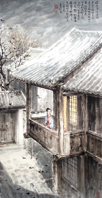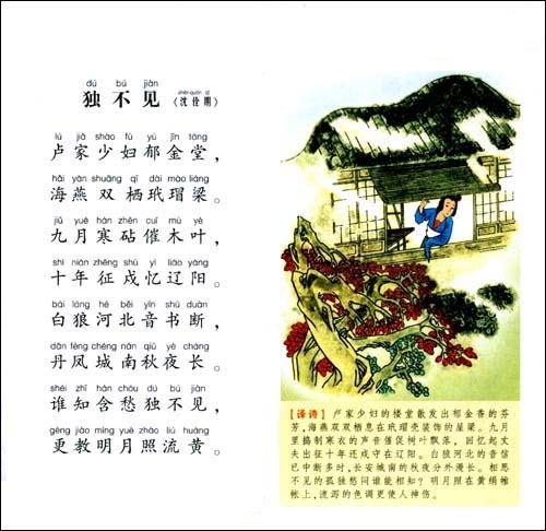 “卢家少妇郁金堂,海燕双栖玳瑁梁。”卢家少妇,名莫愁,梁武帝萧衍诗中的人物,后来用作少妇的代称。郁金是一种香料,和泥涂壁能使室内芳香;玳瑁是一种海龟,龟甲极美观,可作装饰品。开头两句以重彩浓笔夸张地描绘女主人公闺房之美:四壁以郁金香和泥涂饰,顶梁也用玳瑁壳装点起来,无比芬芳,无比华丽。连海燕也飞到梁上来安栖了。“双栖”两字,暗用比兴。看到梁上海燕那相依相偎的柔情密意,这位“莫愁”女也许有所感触吧。此时,又听到窗外西风吹落叶的声音和频频传来的捣衣的砧杵之声。秋深了,天凉了,家家户户忙着准备御冬的寒衣,有征夫游子在外的人家,就更要格外加紧了。这进一步勾起少妇心中之愁。“寒砧催木叶”,造句十分奇警。分明是萧萧落叶催人捣衣而砧声不止,诗人却故意主宾倒置,以渲染砧声所引起的心理反响。事实上,正是寒砧声落叶声汇集起来在催动着闺中少妇的相思,促使她更觉内心的空虚寂寞,更觉不见所思的愁苦。夫婿远戍辽阳,一去就是十年,她的苦苦相忆,也已整整十年了。