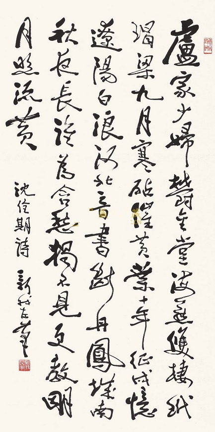 这首诗,人物心情与环境气氛密切结合。“海燕双栖玳瑁梁”烘托“卢家少妇郁金堂”的孤独寂寞,寒砧木叶、城南秋夜,烘托“十年征戍忆辽阳”、“白狼河北音书断”的思念忧愁,尾联“含愁独不见”的情语借助“明月照流黄”的景物渲染,便显得余韵无穷。论手法,则有反面的映照(“海燕双栖”),有正面的衬托(“木叶”、“秋夜长”),多方面多角度地抒写了女主人公“思而不得见”的愁肠。诗虽取材于闺阁生活,语言也未脱尽齐梁以来的浮艳习气,却显得境界广远,气势飞动,读起来给人一种“顺流直下”(《诗薮·内编》卷五)之感。