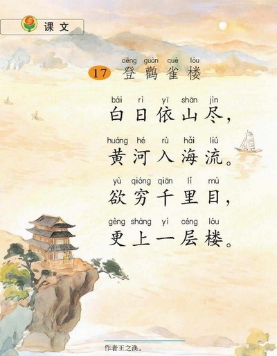 太阳依傍山峦渐渐下落,黄河向着大海滔滔东流。如果要想遍览千里风景,请再登上一层高楼。