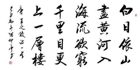 前两句写所见。“白日依山尽”写山,“黄河入海流”写水。诗人遥望一轮落日向着楼前一望无际、连绵起伏的群山西沉,在视野的尽头冉冉而没;目送流经楼前下方的黄河奔腾咆哮、滚滚南来,又在远处折而东向,流归大海。诗人运用极其朴素、极其浅显的语言,既高度形象又高度概括地把进入广大视野的万里河山,收入短短十个字中,画面宽广辽远。