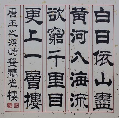 白日依山尽,黄河入海流。出自唐代诗人王之涣作品《登鹳雀楼》,前两句写的是自然景色,但开笔就有缩万里于咫尺,使咫尺有万里之势;后两句写意,写的出人意料,把哲理与景物、情势溶化得天衣无缝,成为鹳雀楼上一首不朽的绝唱。