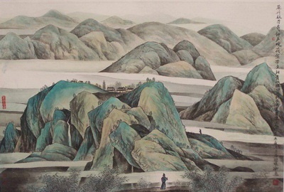 身背斗笠在夕阳的映照下,正独自沿着青山走向远方。