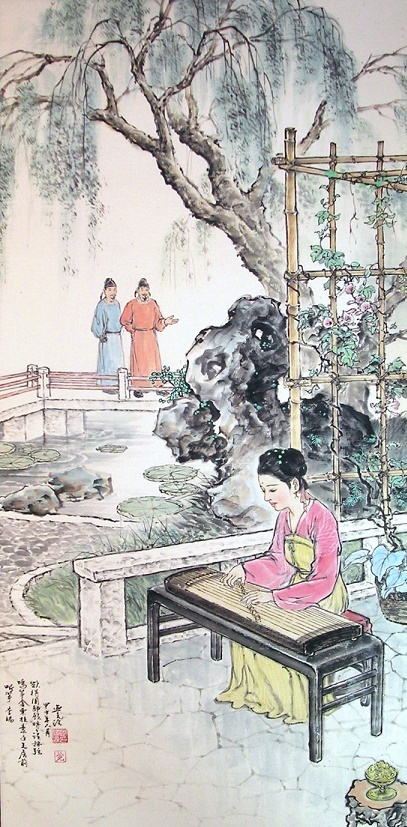 “欲得周郎顾,时时误拂弦。”诗人终于注意到弹奏出的乐曲本身。诗的前两句写女子正在弹筝,按此写法,接下去似乎应该描写女了的弹奏技艺,或者表现秦筝极富感染力的音乐形象,但出人意料的是,三、四句并不沿袭通常的写法,而是描写女子为了引起知音者的注意,故意错拨筝弦。相传三国时代的周瑜,别人奏曲有误,他就回头一看,此诗显然受到了这个故事的启发。“时时”说明这并非偶尔失手,也并非技艺低下,因为这失误明显地属于有意为之。有人将她的有意错弹理解为“妇人卖弄身份,巧于撩拨”(清·徐增《而庵说唐诗》),似乎弹筝女子的微妙心理,仅仅是一种邀宠之情;其实这种故意的失误是出于寻觅知音的苦心。她大约也是沦落风尘之人,对一般浪荡子弟,她的故意错弹饱含着对这班人的嘲弄和蔑视,但总会有一天,真正的知音——她的“周郎”会听出那曲中的深意,从而向她投去会心的一“顾”的。此处的“周郎”喻指听者,“欲得”就意味着当时坐在一旁的“周郎”没有看她。为什么不看她呢?大概听者已经完全陶醉在那美妙的筝声中了。本来这应该是演奏者最祈盼的效果,最欣慰的时刻,然而,这情景却不是这位女子此时最渴望的效果,因为她心中另有所思,思不在听者赏音,而在于一“顾”,怎么办呢?她灵机一动,故意不时地错拨一两个音,于是充满戏剧性的场景出现了:那不谐和的旋律,突然惊动了沉醉在音乐境界中的“周郎”,他下意识地眉头一皱,朝她一看,只见她非但没有丝毫“误拂”的遗憾和歉意,两眼反而闪烁出得意的眼神——原来是误非真误。为了所爱慕的人顾盼自己,便故意将弦拨错,弹筝女的可爱形象跃然纸上。这两句正面写出了弹者藏巧于拙,背面又暗示了听者以假当真,而这种巧与拙、假与真,又在那无言的一顾之中获得了奇妙的统一。它不仅说明弹者是高手,听者是知音,而且传神地表现出两者的心理神态,其意趣韵味无穷。
