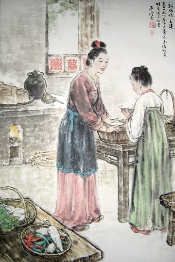 “三日入厨下,洗手作羹汤。”古代女子嫁后的第三天,俗称“过三朝”,依照习俗要下厨房做菜。“三日”,正见其为“新嫁娘”。“洗手作羹汤”,“洗手”标志着第一次用自己的双手在婆家开始她的劳动,表现新媳妇郑重其事,力求做得洁净爽利。