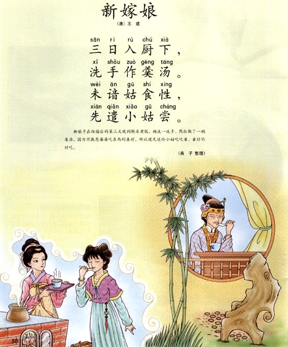 未谙姑食性,先遣小姑尝。出自唐代诗人王建作品《新嫁娘词三首》。这组诗写的是一位刚刚嫁入夫家的新娘的感受,描写了当时社会新媳妇难当的社会现实。其中第三首诗通过寥寥几笔,就把新娘子欲讨好婆婆却又唯恐得罪婆婆这种进退两难的心境惟妙惟肖地展现出来,历来广为传诵。