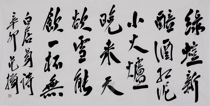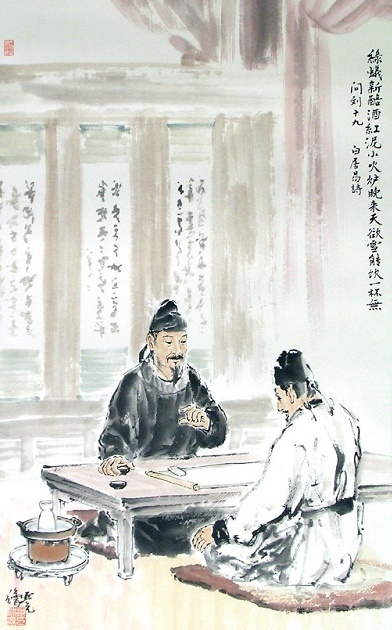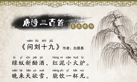 绿蚁新醅酒,红泥小火炉。出自唐代诗人白居易作品《问刘十九》。此诗描写诗人在一个风雪飘飞的傍晚邀请朋友前来喝酒,共叙衷肠的情景。诗以如叙家常的语气,朴素亲切的语言,通过写对把酒共饮的渴望,体现了朋友间诚恳亲密的关系。全诗简练含蓄,轻松洒脱,而诗句之间,意脉相通,一气贯之。