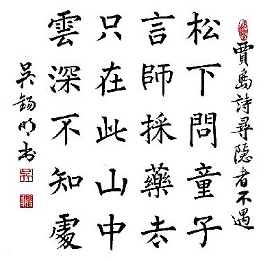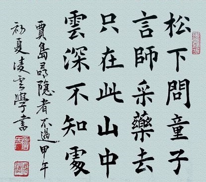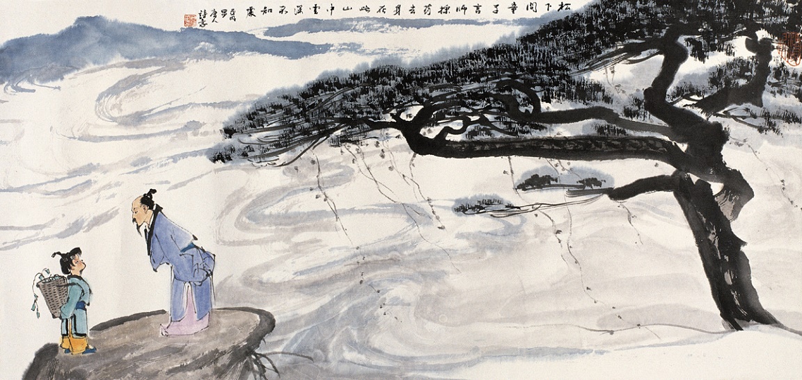 苍松下,我询问了年少的学童;他说,师傅已经采药去了山中。