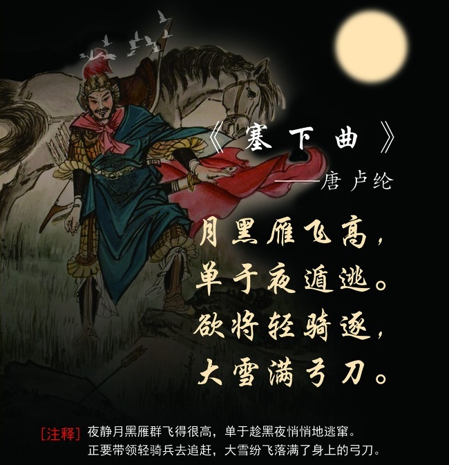 这是卢纶《塞下曲》组诗中的第三首。卢纶曾任幕府中的元帅判官,对行伍生活有体验,描写此类生活的诗比较充实,风格雄劲。这首诗写将军雪夜准备率兵追敌的壮举,气概豪迈。 前两句写敌军的溃逃。“月黑雁飞高”,月亮被云遮掩,一片漆黑,宿雁惊起,飞得高高。“单于夜遁逃”,在这月黑风高的不寻常的夜晚,敌军偷偷地逃跑了。“单于”,原指匈奴最高统治者,这里借指当时经常南侵的契丹等族的入侵者。