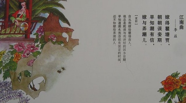 在唐诗中,有不少闺怨诗。闺怨诗写的是闺中怨妇。怨妇怨的是与夫婿分离。这些与妻子别离的夫婿主要有两类人,一为征夫,一为商人。唐代经济繁荣,商业已很发达,丝绸之路正是在那时开辟的。除与中亚各国交易外,国内也有越来越多的商人从事长途贩卖活动。商人长年累月出外经商,致使他们的妻子独守空房,便生出许多怨望来。这就是反映商人妇思夫的闺怨诗的内容。此类闺怨诗正反映了当时较为普遍的社会现象。李益的这首《江南曲》就属于此类闺怨诗。