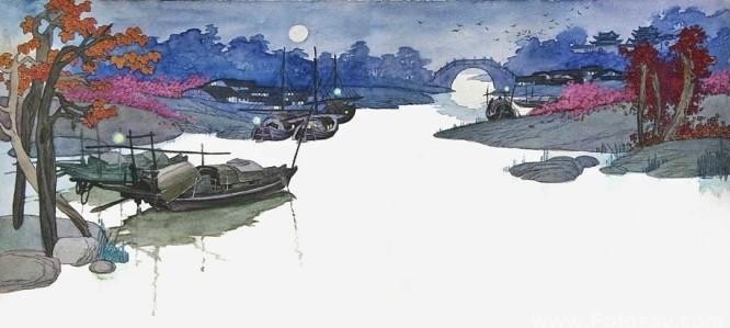 5、江枫:一般解释作“江边枫树”,江指吴淞江,源自太湖,流经上海,汇入长江,俗称苏州河。另外有人认为指“江村桥”和“枫桥”。“枫桥”在吴县南门(阊阖门)外西郊,本名“封桥”,因张继此诗而改为“枫桥”。