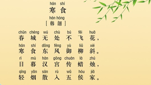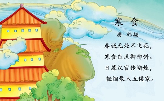 寒食是中国古代一个传统节日,一般在冬至后一百零五天,清明前两天。古人很重视这个节日,按风俗家家禁火,只吃现成食物,故名寒食。唐代制度,到清明这天,皇帝宣旨取榆柳之火赏赐近臣,以示皇恩。这仪式用意有二:一是标志着寒食节已结束,可以用火了;二是藉此给臣子官吏们提个醒,让大家向有功也不受禄的介子推学习,勤政为民。唐代诗人窦叔向有《寒食日恩赐火》诗纪其实:“恩光及小臣,华烛忽惊春。电影随中使,星辉拂路人。幸因榆柳暖,一照草茅贫。”正可与韩翃这一首诗参照。