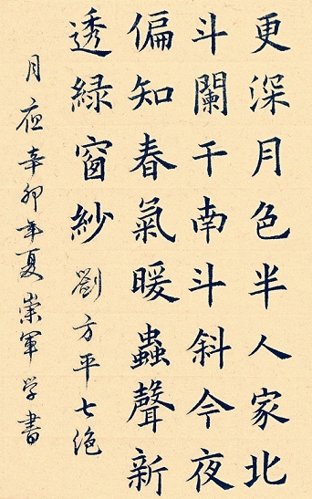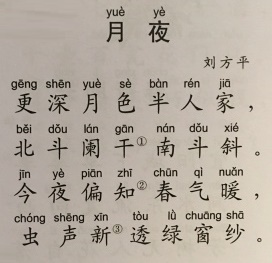 更深月色半人家,北斗阑干南斗斜。出自唐代诗人刘方平作品《月夜》。这首诗记叙作者对初春月夜气候转暖的独特感受。诗的前二句写景,记叙星月西斜,夜深人静。诗的后二句记所闻、所感,因虫声透过窗纱传来,感到已到春暖时节。诗中描绘了一种优美宁静而富有生机的境界,令人感到物候在变化,又是静美的。