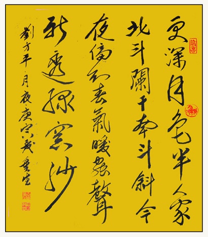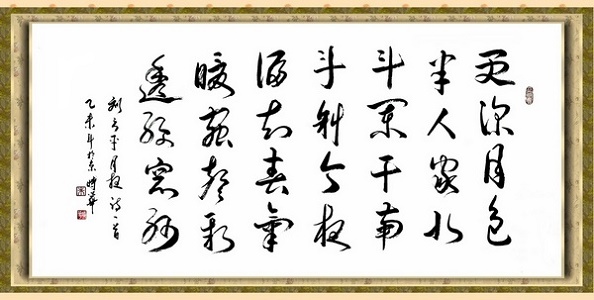 首句的“半人家”是诗中的佳笔,它写出了庄户人家的农舍一半为银白色月晖所包围,而另一半却依然坐落在黑暗中。而组合村庄的大片农舍都是这样一边有光,一边阴暗。如此着色,便使黑者更黑,白者更白,在用光上便能更加突出主体(村落)。这要比让描写的景物全都搽上一层亮色更醒目,也更有艺术美。有不少注本谓“半人家”是指一半人家,倒也能说得通,但诗句却无一点灵气了。“月色半人家”是“更深”二字的具体化,接下的一句“北斗阑干南斗斜”,以互文手法解释,即北斗和南斗都发生了倾斜变化,这样就可看出时间的推移,已从入夜而接近更深了。此是“更深”于夜空的征象,两句一起造成春夜的静穆,意境深邃。月光半照,是因为月轮西斜,诗以星斗阑干为映衬,这就构成两句之间的内在关联。