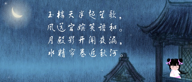 “玉楼天半起笙歌,风送宫嫔笑语和。”描写受宠者的欢乐情景,笙歌四起,月光如水,和风习习,一阵阵欢声笑语。“天半”,诗中用来形容楼高。其实,其中还隐含着抒情女主人公不能像其他宫妃那样得到皇帝宠幸的怨意在内。诗中那些得宠的嫔妃,能进入高及“天半”的玉楼中,这就暗喻她们有机会见到君王,有机会得到恩宠。