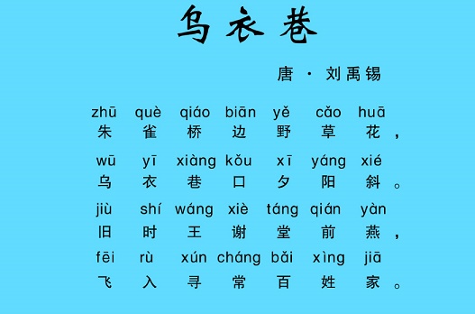 旧时王谢堂前燕,飞入寻常百姓家。出自唐代诗人刘禹锡作品《乌衣巷》。这是一首抚今吊古的诗篇是怀古组诗《金陵五题》中的第二首。此诗凭吊昔日东晋南京秦淮河上朱雀桥和南岸的乌衣巷的繁华鼎盛,而今野草丛生,荒凉残照,感慨沧海桑田,人生多变。作者选取燕子寄居的主人家已经不是旧时的主人这一平常现象,使人们认识到富贵荣华难以常保,那些曾经煊赫一时的达官贵族,如过眼烟云,成为历史的陈迹。诗中没有一句议论,而是通过野草、夕阳的描写,以燕子作为盛衰兴亡的见证,巧妙地把历史和现实联系起来,引导人们去思考时代的发展和社会的变化,含着深刻的寓意。全诗语虽极浅,味却无限。
