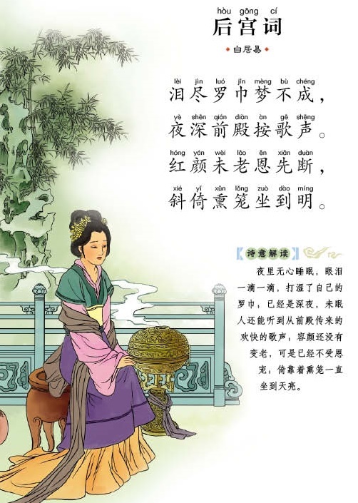 泪湿罗巾梦不成,夜深前殿按歌声。出自唐代诗人白居易作品《后宫词》。这是代宫人所作的怨词。首句写夜来不寐,梦想君王临幸;二句写忽闻前殿歌声,君王来幸无望;三句写红颜犹在,君恩已断之苦;四句写再幻想君王可能来幸,于是斜倚熏笼,坐待至天明,终成泡影。全诗语言明快自然,感情真挚而多层次,细腻地刻划了失宠宫女千回百转的心理状态。
