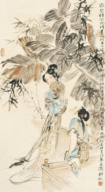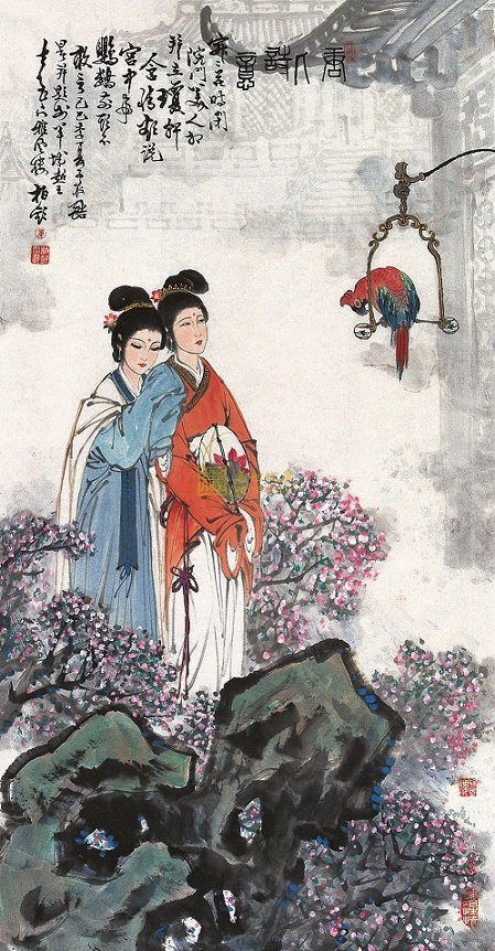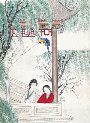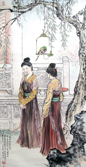 看了上半首诗,也许有人会猜测:诗人之所以使双美并立,大概是要让她们互吐衷曲,从她们口中诉出怨情吧。可是,接着看下去,诗人却并没有让这两位女主角开口。从“含情欲说宫中事”这第三句诗中看到的,只是一个含情不吐、欲说还休的场面。而且,所含之情是什么情,欲说之事是什么事,也没有去点破它。也许还会猜测:既然“含情”,既然“欲言”,大概最后总要让她们尽情一吐、畅所欲言。可是,读到终篇,看了“鹦鹉前头不敢言”一句,这才知道:原来这幅双美图始终是一幅无声的画,而这两位画中人之始而欲言,终于无言,既不是因为感情微妙到难以言传,也不是因为事情隐秘到羞于出口,只是有所畏忌而“不敢言”。那么,其所含之情自是怨情,欲言之事决非乐事,就不言而喻了。