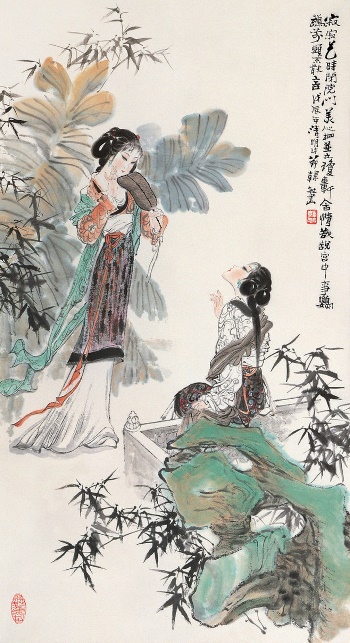 诗从写景入手。它的首句“寂寂花时闭院门”,既是以景衬情,又是景中见情。就以景衬情而言,它是以春花盛开之景从反面来衬托这首诗所要表达的美人幽怨之情,从而收到王夫之在《诗绎》中所说的“以乐景写哀”、“倍增其哀”的艺术效果。就景中见情而言,它虽然写的是“花时”,却在重门深闭的环境之中,给人以“寂寂”之感,从而在此句中已经把哀情注入了乐景,对景中人的处境和心情已经作了暗示。这样,在第二句中把两位主角引进场时,就只要展示一幅“美人相并立琼轩”的画面,而不必再费笔墨去写她们被关闭在深宫中的凄凉处境和寂寞愁苦的心情了。