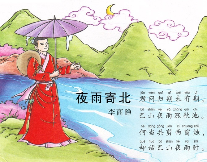 1、寄北:写诗寄给北方的人。诗人当时在巴蜀(现在四川省),他的亲友在长安,所以说“寄北”。这首诗表达了诗人对亲友的深刻怀念。