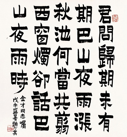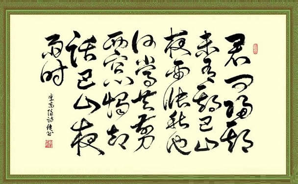 上述艺术构思的独创性又体现于章法结构的独创性。“期”字两见,而一为妻问,一为己答;妻问促其早归,己答叹其归期无准。“巴山夜雨”重出,而一为客中实景,紧承己答;一为归后谈助,遥应妻问。而以“何当”介乎其间,承前启后,化实为虚,开拓出一片想象境界,使时间与空间的回环对照融合无间。近体诗,一般是要避免字面重复的,这首诗却有意打破常规,“期”字的两见,特别是“巴山夜雨”的重出,正好构成了音调与章法的回环往复之妙,恰切地表现了时间与空间回环往复的意境之美,达到了内容与形式的完美结合。