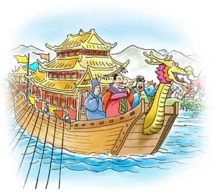 春游中全国裁制的绫罗锦缎,一半作御马障泥一半作船帆。
