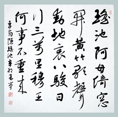 ⑴瑶池阿母:《穆天子传》卷三:“天子宾于西王母,天子觞西王母于瑶池之上。西王母为天子谣曰:‘白云在天,山陵自出。道里悠远,山川间之。将子无死,尚能复来。’天子答之曰:‘予归东土,和治诸夏。万民平均,吾顾见汝。比及三年,将复而野。’”《武帝内传》称王母为“玄都阿母”。绮窗:绘饰如绮之窗户。吕向注:“绮窗,雕画若绮也。”