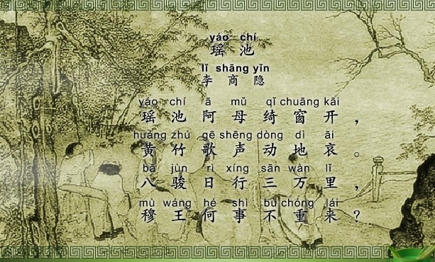 八骏日行三万里,穆王何事不重来?出自唐代诗人李商隐作品《瑶池》。这首诗是借周穆王西游遇仙人西王母的神话,讥刺皇帝求仙的虚妄。全诗虚构了西王母盼不到周穆王重来,暗示穆王已故的故事情节,显示了求仙妄想与死亡不可避免的对立。