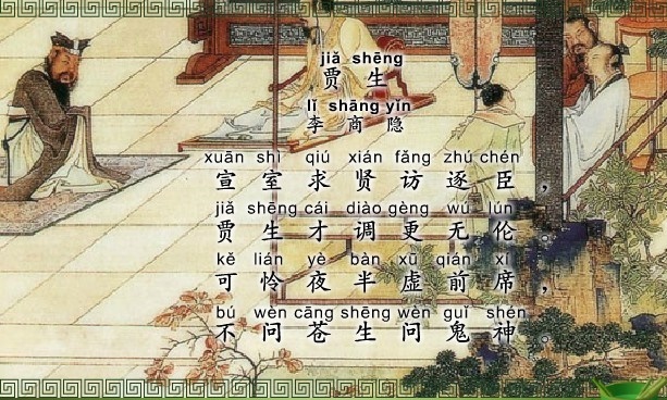 贾谊被贬长沙,久已成为诗人们抒写不遇之感的熟滥题材。《史记·屈原贾生列传》载:“贾生征见。孝文帝方受厘(刚举行过祭祀,接受神的福佑),坐宣室(未央宫前殿正室)。上因感鬼神事,而问鬼神之本。贾生因具道所以然之状。至夜半,文帝前席(在坐席上移膝靠近对方)。既罢,曰:“吾久不见贾生,自以为过之,今不及也。”作者却独辟蹊径,特意选取贾谊自长沙召回,宣室夜对的情节作为诗材。在一般封建文人心目中,这大概是值得大加渲染的君臣遇合盛事。但诗人却独具慧眼,抓住不为人们所注意的“问鬼神”之事,讽刺晚唐幻想成仙、荒于政事的帝王。诗歌欲抑先扬,发出了一段新警透辟、发人深省的议论。