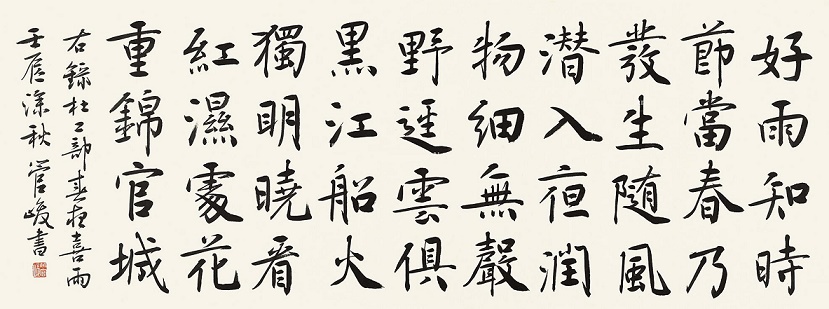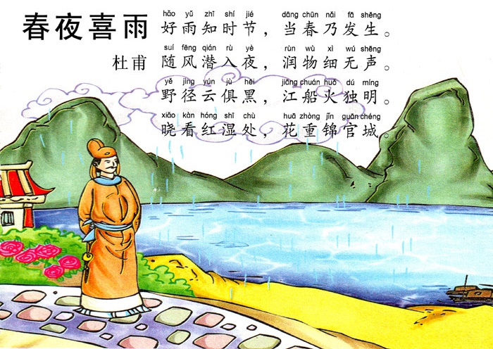 好雨知时节,当春乃发生。出自唐代诗人杜甫作品《春夜喜雨》,是唐诗名篇之一,是杜甫上元二年(761年)在成都草堂居住时所作。此诗运用拟人手法,以极大的喜悦之情细致地描绘了春雨的特点和成都夜雨的景象,热情地讴歌了来得及时、滋润万物的春雨。诗中对春雨的描写,体物精微,细腻生动,绘声绘形。全诗意境淡雅,意蕴清幽,诗境与画境浑然一体,是一首传神入化、别具风韵的咏雨诗。