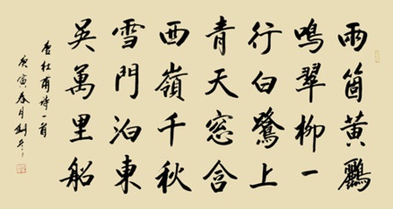 苏轼曾经说过:“少陵翰墨无形画”。此诗就像一幅绚丽生动的山水条幅:黄鹂、翠柳、白鹭、青天、江水、雪山,色调淡雅和谐,图象有动有静。画的中心是几棵翠绿的垂柳,黄莺儿在枝头婉转歌唱;画的上半部是青湛湛的天,一行白鹭映于碧空;远处高山明灭可睹,遥望峰巅犹是经年不化的积雪;近处露出半边茅屋,门前一条大河,水面停泊着远方来的船只。从颜色和线条看,作者把两笔鹅黄点染在一片翠绿之中,在青淡的空间斜勾出一条白线。点线面有机结合,色彩鲜明而又和谐。诗人身在草堂,思接千载,视通万里,胸次开阔,出语雄健。全诗对仗精工,着色鲜丽,动静结合,声形兼俱,每句诗都是一幅画,又宛然组成一幅咫尺万里的壮阔山水画卷。