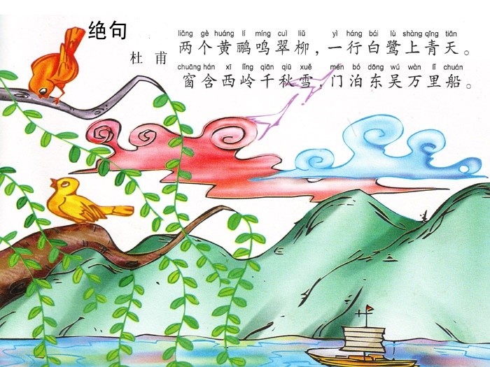 黄鹂在新绿的柳条间叫着春天,成双作对好喜庆;白鹭排成行迎着春风飞上青天,队列整齐真优美。那西岭的雪峰啊,像一幅美丽的画嵌在窗框里;这门前的航船啊,竟是从万里之外的东吴而来。