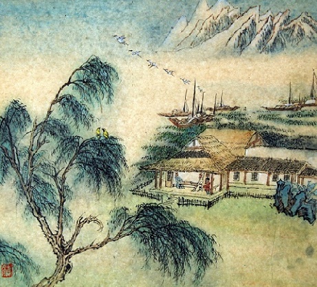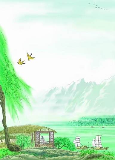 “两个黄鹂鸣翠柳,一行白鹭上青天。 窗含西岭千秋雪,门泊东吴万里船。”黄鹂、翠柳显出活泼的气氛,白鹭、青天给人以平静、安适的感觉。“鸣”字表现了鸟儿的怡然自得。“上”字表现出白鹭的悠然飘逸。黄、翠、白、青,色泽交错,展示了春天的明媚景色,也传达出诗人欢快自在的心情。诗句有声有色,意境优美,对仗工整。一个“含”字,表明诗人是凭窗远眺,此景仿佛是嵌在窗框中的一幅图画。这两句表现出诗人心情的舒畅和喜悦。“西岭”,即成都西南的岷山,其雪常年不化,故云“千秋雪”。“东吴”,三国时孙权在今江苏南京定都建国,国号为吴,也称东吴。这里借指长江下游的江南地区。“千秋雪”言时间之久,“万里船”言空间之广。诗人身在草堂,思接千载,视通万里,胸襟何等开阔!这两句也是全诗的点睛之笔,境界开阔,情志高远。在空间和时间两个方面拓宽了广度,使得全诗的立意一下子卓尔不群,既有杜诗一贯的深沉厚重,又舒畅开阔,实为千古名句。