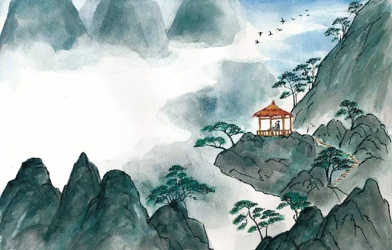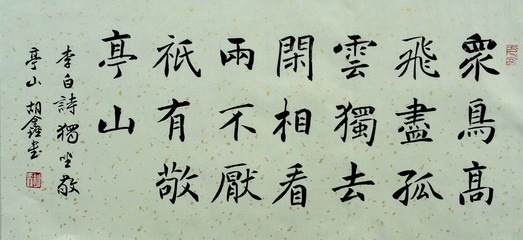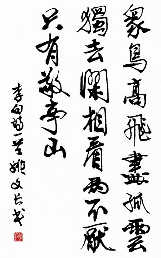 此诗前两句“众鸟高飞尽,孤云独去闲”,看似写眼前之景,其实,把伤心之感写尽了:天上几只鸟儿高飞远去,直至无影无踪;寥廓的长空还有一片白云,却也不愿停留,慢慢地越飘越远,似乎世间万物都在厌弃诗人。“尽”、“闲”两个字,把读者引入一个“静”的境界:仿佛是在一群山鸟的喧闹声消除之后格外感到清静;在翻滚的厚云消失之后感到特别的清幽平静,尽既有消失的意思,又有慢慢消失在天际的感觉。闲,主要是为了表达闲适的感情,是以孤云的闲适衬托作者心境的闲适。这两个词对“独”有意境上的烘托作用。主要是为了写作者此刻独坐但情意悠然,很符合李白本人的仙道思想。