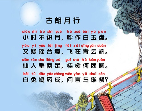 小时不识月,呼作白玉盘。出自唐代诗人李白作品《古朗月行》,是诗人借乐府古题所作的一首五言古诗。此诗作于安史之乱之前不久。此诗先写儿童时期对月亮稚气的认识,写出了月亮初升时逐渐明朗和宛若仙境般的景致,接着写月亮渐渐地由圆而蚀,继而沦没而迷惑不清,心中感到忧愤不平。诗人运用浪漫主义的创作方法,通过丰富的想象,神话传说的巧妙加工,以及强烈的抒情,构成瑰丽神奇而含意深蕴的艺术形象。全诗文辞如行云流水,富有魅力,发人深思,体现出李白诗歌雄奇奔放、清新俊逸的风格。