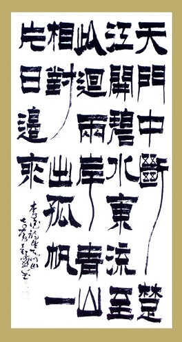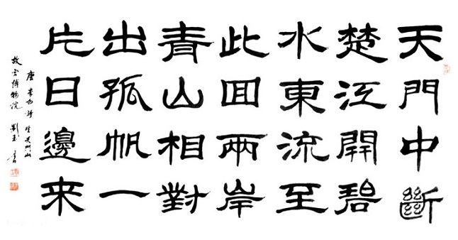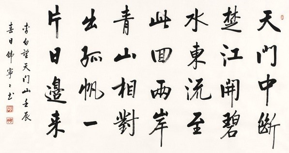 天门中断楚江开,碧水东流至此回。出自唐代诗人李白作品《望天门山》。是诗人于开元十三年(725)赴江东途中行至天门山时所创作的一首七绝。此诗描写了诗人舟行江中顺流而下远望天门山的情景:前两句用铺叙的方法,描写天门山的雄奇壮观和江水浩荡奔流的气势;后两句描绘出从两岸青山夹缝中望过去的远景。全诗通过对天门山景象的描述,赞美了大自然的神奇壮丽,表达了作者初出巴蜀时乐观豪迈的感情,展示了作者自由洒脱、无拘无束的精神风貌。作品意境开阔,气象雄伟,动静虚实,相映成趣,并能化静为动,化动为静,给人一种新鲜的意趣。
