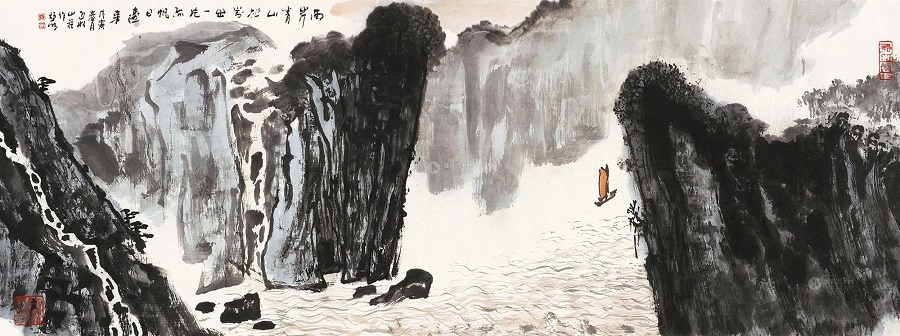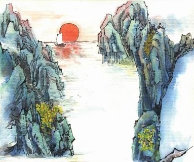 “两岸青山相对出,孤帆一片日边来。”这两句是一个不可分割的整体。第三句承前第一句写望中所见天门两山的雄姿;第四句承前第二句写长江江面的远景,点醒“望”的立脚点和表现诗人的淋漓兴会。诗人并不是站在岸上的某一个地方遥望天门山,他“望”的立脚点便是从“日边来”的“一片孤帆”。读这首诗的人大都赞赏“两岸青山相对出”的“出”字,因为它使本来静止不动的山带上了动态美,但却很少去考虑诗人何以有“相对出”的感受。如果是站在岸上某个固定的立脚点“望天门山”,那大概只会产生“两岸青山相对立”的静态感。反之,舟行江上,顺流而下,望着远处的天门两山扑进眼帘,显现出愈来愈清晰的身姿时,“两岸青山相对出”的感受就非常突出了。“出”字不但逼真地表现了在舟行过程中“望天门山”时天门山特有的姿态,而且寓含了舟中人的新鲜喜悦之感。夹江对峙的天门山,似乎正迎面向自己走来,表示它对江上来客的欢迎。青山既然对远客如此有情,则远客自当更加兴会淋漓。“孤帆一片日边来”,正传神地描绘出孤帆乘风破浪,越来越靠近天门山的情景,和诗人欣睹名山胜景、目接神驰的情状。由于末句在叙事中饱含诗人的激情,这首诗便在描绘出天门山雄伟景色的同时突出了诗人豪迈、奔放、自由洒脱、无拘无束的自我形象。