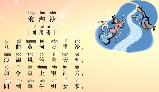 九曲黄河万里沙,浪淘风簸自天涯。出自唐代诗人刘禹锡作品《浪淘沙九首》的第一首诗。诗句意思:九曲黄河从遥远的地方蜿蜒奔腾而来,一路裹挟着万里的黄沙。你从天边而来,如今好像要直飞上高空的银河,请你带上我扶摇直上,汇集到银河中去,一同到牛郎和织女的家里做客吧。