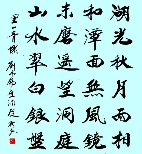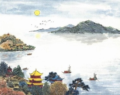 诗从一个“望”字着眼,“水月交融”、“湖平如镜”,是近望所见;“洞庭山水”、“犹如青螺”,是遥望所得。虽都是写望中景象,差异却显而易见。近景美妙、别致;远景迷潆、奇丽。潭面如镜,湖水如盘,君山如螺。银盘与青螺相映,明月与湖光互衬,更觉情景相容、相得益彰。诗人笔下的君山犹如镶嵌在明镜洞庭湖上一颗精美绝伦的翡翠,令人美不胜收。其用词也极精到。