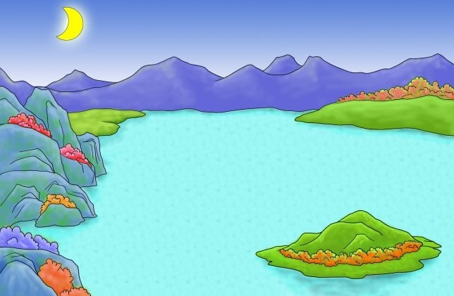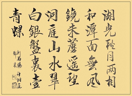 秋夜明月清辉,遍洒澄净湖面,湖面平静无风,犹如铁磨铜镜。遥望美丽洞庭的湖光山色。真的令人浮想联翩。那翠绿的君山,真像银盘里的一枚玲珑青螺。