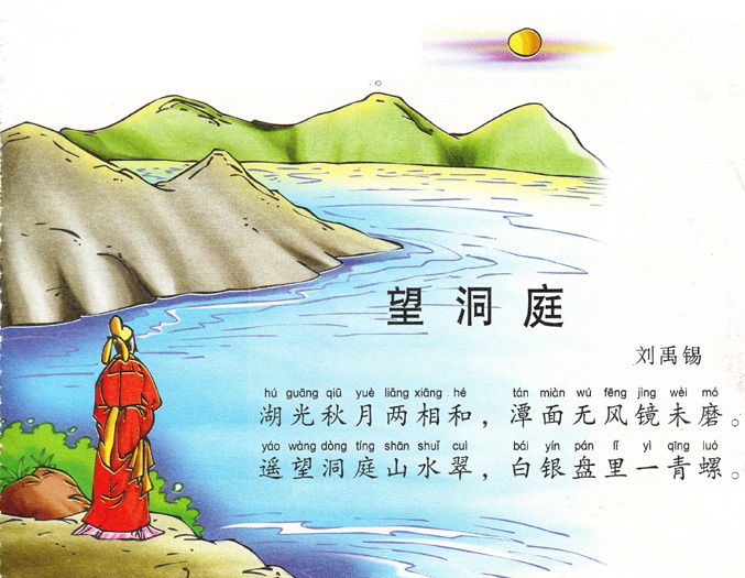 遥望洞庭山水翠,白银盘里一青螺。出自唐代诗人刘禹锡作品《望洞庭》。此诗描写了秋夜月光下洞庭湖的优美景色。首句描写湖水与素月交相辉映的景象,第二句描绘无风时湖面平静的情状,第三、四句集中描写湖中的君山。全诗极富有浪漫色彩的奇思壮采,通过对洞庭湖高旷清超的描写,充分表现出诗人的奇思异采,表达了诗人对洞庭湖的喜爱和赞美之情。