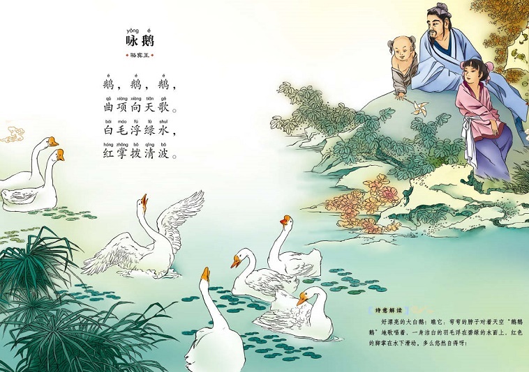 “鹅!鹅!鹅!”面向蓝天,一群鹅儿伸着弯曲的脖子在歌唱。雪白的羽毛漂浮在碧绿的水面上,红色的脚掌划着清波,就像船浆一样。