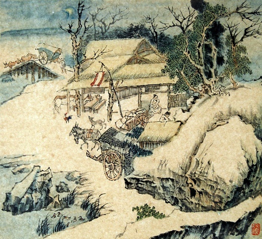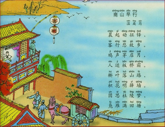 古时旅客为了安全,一般都是“未晚先投宿,鸡鸣早看天”。诗人既然写的是早行,那么鸡声和月是必然要体现的。而茅店又是山区有特征性的景物。“鸡声茅店月”,把旅人住在茅店里,听见鸡声就爬起来看天色,看见天上有月,就收拾行装,起身赶路的特征都有声有色地表现了出来。