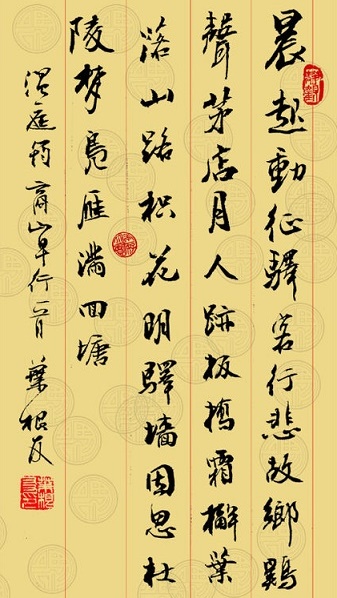 黎明起身,套子驾车铃声叮当。踏上征途,游子不禁思念故乡。残月高挂,村野客店传来声声鸡叫;板桥清霜,先行客人留下行行足迹。槲树枯叶,飘落山路;枳树白花,映亮店墙,触景伤情。不由想起夜回长安的梦境。野鸭大雁,早已挤满堤岸曲折的湖塘。